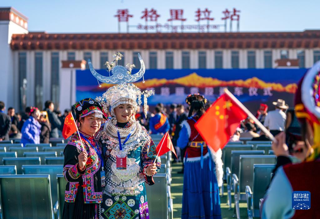 11月26日,參加麗香鐵路開(kāi)通儀式的少數民族代表在開(kāi)通儀式上拍照留念。