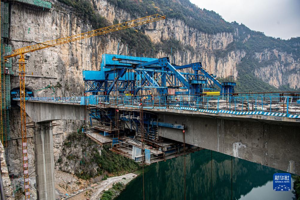 11月26日,在位于重慶市酉陽(yáng)土家族苗族自治縣龔灘鎮的阿蓬江大橋施工建設現場(chǎng),工人正在現場(chǎng)作業(yè)。