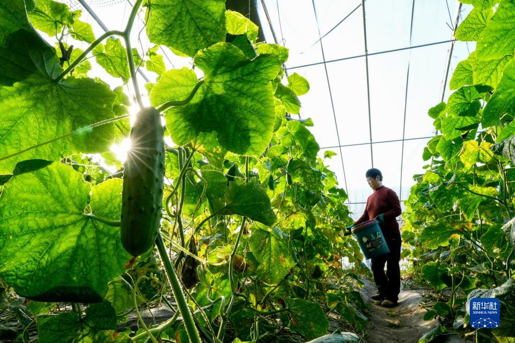 11月26日,河北省灤州市茨榆坨鎮蘆葦莊村農民在大棚內采摘黃瓜。