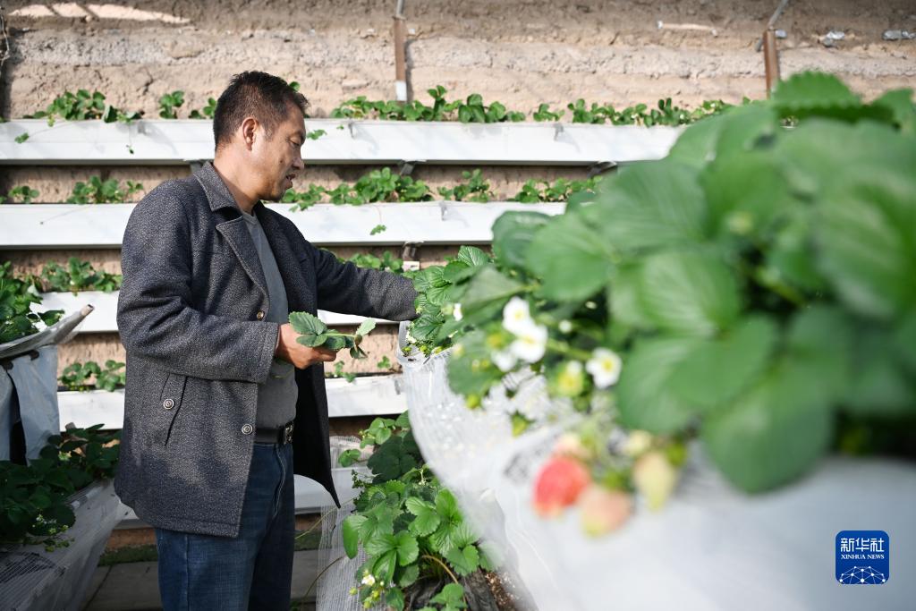 11月26日,寧夏銀川市金鳳區良田鎮植物園村農戶(hù)在大棚里打理草莓苗。