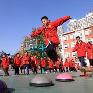 11月27日,河北省石家莊市仁華小學(xué)學(xué)生在大課間進(jìn)行“匍匐前進(jìn)”游戲。