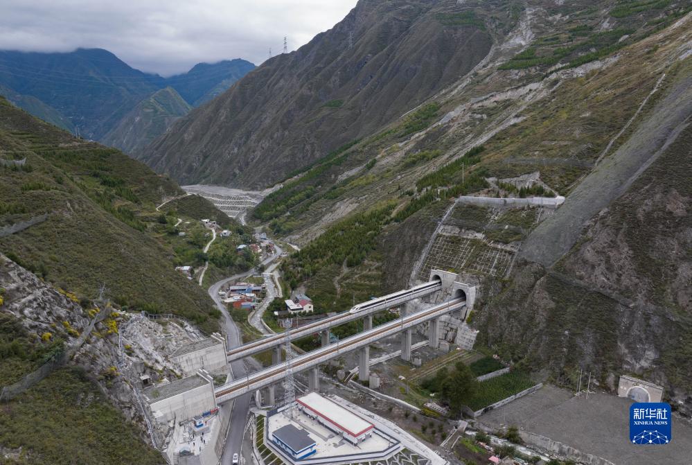 調試列車(chē)駛出川青鐵路榴桐寨隧道(11月13日攝,無(wú)人機照片)。