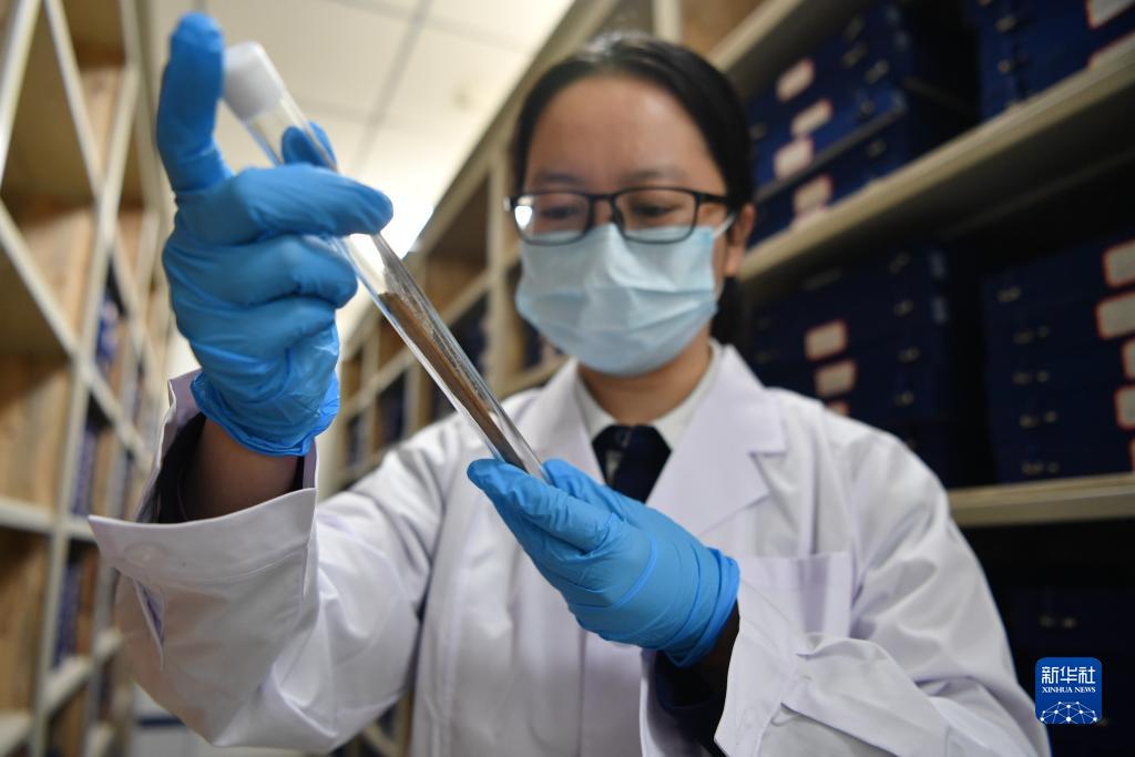 甘肅簡(jiǎn)牘博物館科技保護部文物庫房管理員楊升在文物庫房?jì)炔榭春?jiǎn)牘保存情況(10月26日攝)。新華社記者 陳斌 攝