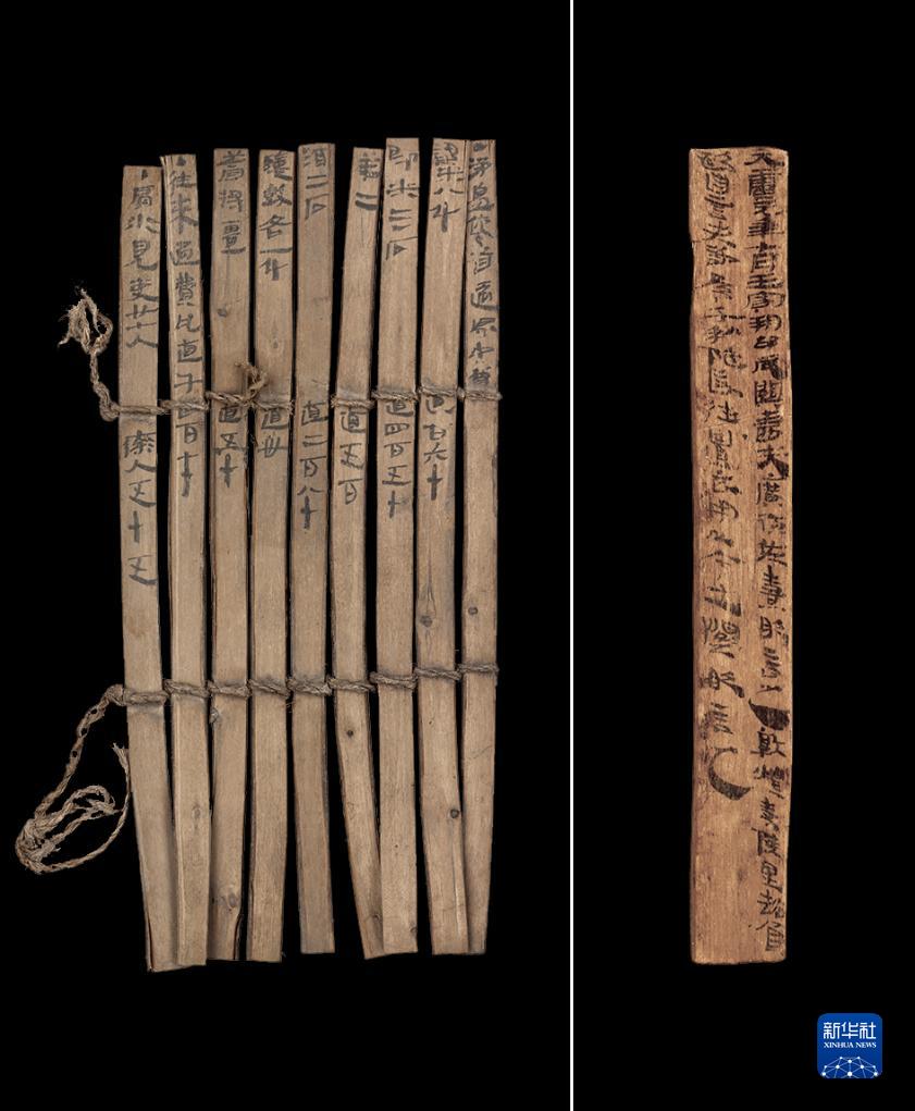 拼版照片:漢簡(jiǎn)《勞邊使者過(guò)界中費》(左圖)和《敦煌女子趙負送衣記》。新華社發(fā)(甘肅簡(jiǎn)牘博物館供圖)