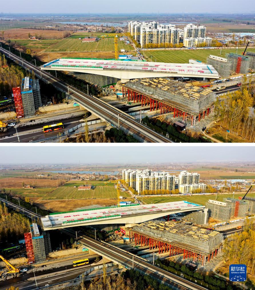 這是一張拼版照片。上圖為濟(寧)曲(阜)快速路上跨京滬鐵路立交橋連續梁轉體作業(yè)前的畫(huà)面;下圖為濟(寧)曲(阜)快速路上跨京滬鐵路立交橋連續梁成功轉體后的畫(huà)面(11月28日攝,無(wú)人機照片)。