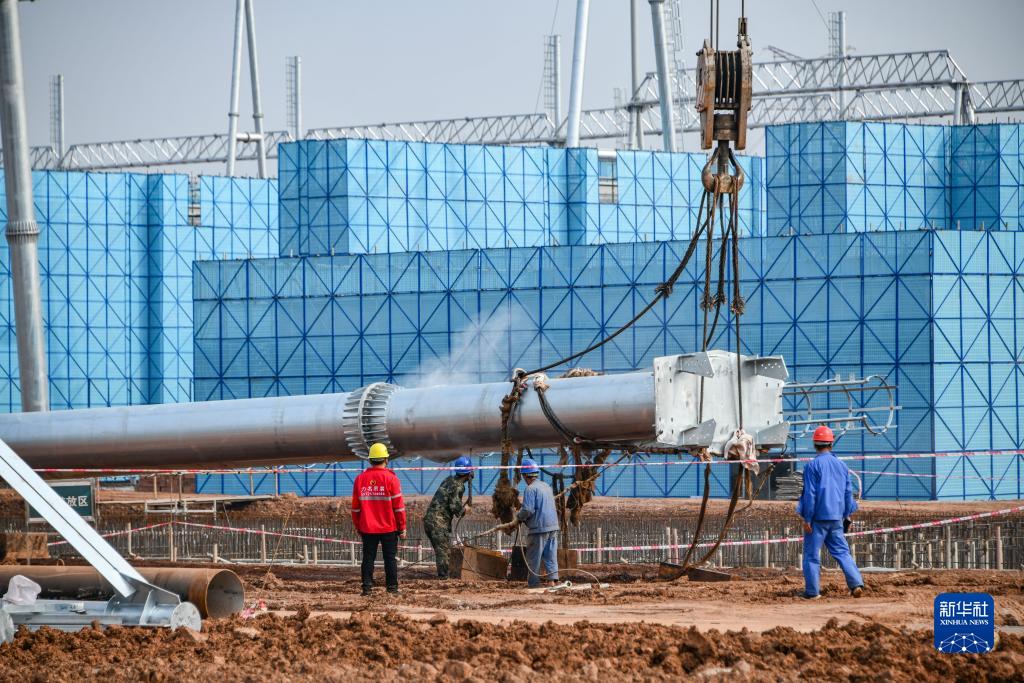 這是11月28日在重慶市銅梁區少云鎮拍攝的銅梁1000千伏變電站構架吊裝作業(yè)現場(chǎng)。