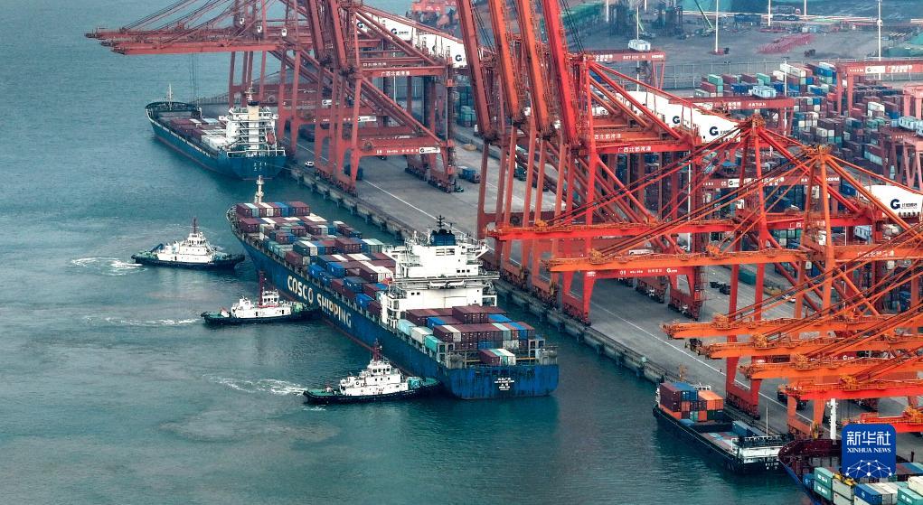 在廣西欽州港,三艘海事船助力一艘海輪??坎次唬?1月24日攝,無(wú)人機照片)。
