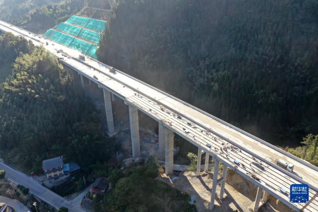 這是建設中的廣西龍勝各族自治縣境內的龍勝至城步高速公路(無(wú)人機照片,11月28日攝)。