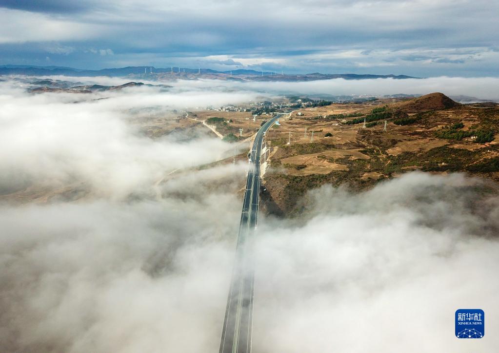 云霧中的貴州省六威高速公路觀(guān)風(fēng)海大橋(2018年12月19日攝,無(wú)人機照片)。新華社發(fā)(何歡 攝)