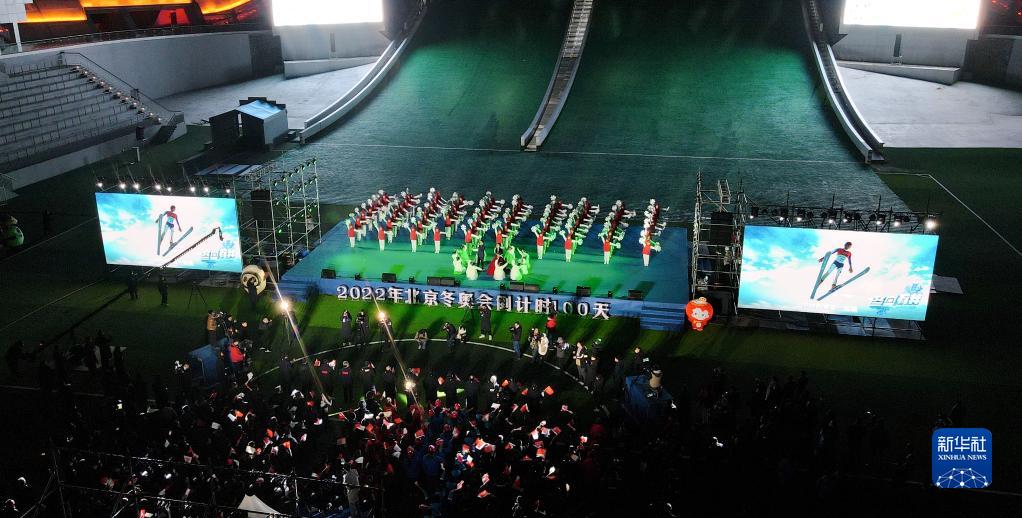 10月26日,“來(lái)自崇禮的邀約”——北京2022年冬奧會(huì )倒計時(shí)100天慶?;顒?dòng)在河北省張家口市崇禮區國家跳臺滑雪中心“雪如意”舉行(無(wú)人機照片)。新華社記者 金皓原 攝