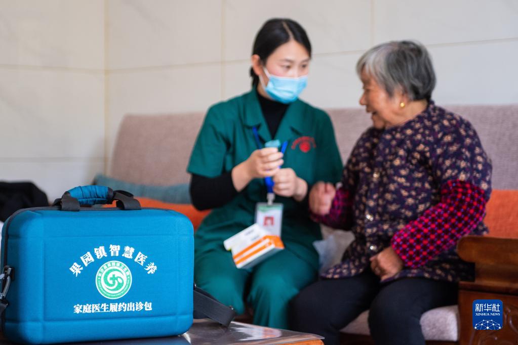 11月12日,在湖南省長(cháng)沙市長(cháng)沙縣果園鎮楊泗廟社區,醫務(wù)人員劉敏指導居家老人用藥。新華社記者 陳思汗 攝