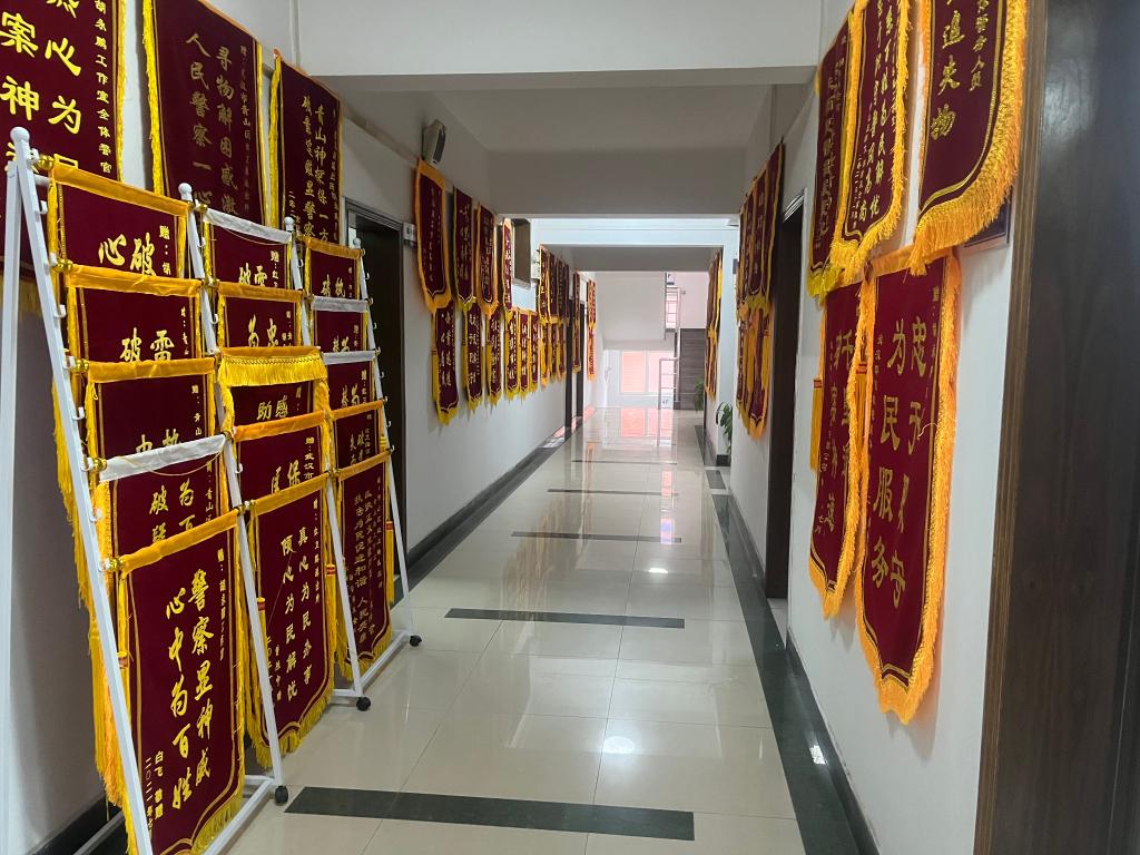 在武漢市公安局青山區分局紅衛路街派出所,群眾送給胡永鵬的致謝錦旗掛滿(mǎn)了走廊墻壁。(武漢市公安局青山區分局提供)