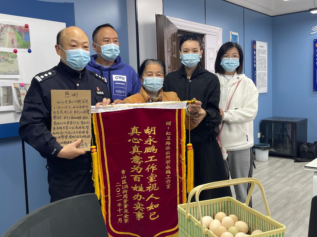 2021年12月6日,群眾前來(lái)派出所向胡永鵬贈送致謝錦旗。(武漢市公安局青山區分局提供)