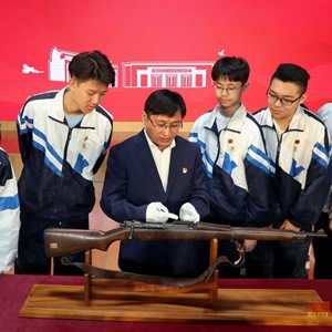 2021年10月25日,上海中學(xué)的學(xué)生近距離觀(guān)看革命文物——上海支前工人李增祥擊落美機時(shí)所用M1903步槍。這堂特別的思政課是中共一大紀念館“百物進(jìn)百校,百講證百年”活動(dòng)的第一講。新華社記者 劉穎 攝