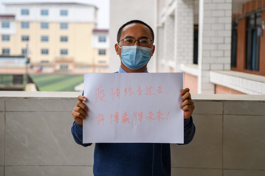 ↑東興中學(xué)物理老師何贊為高三學(xué)生加油(1月5日攝)。
