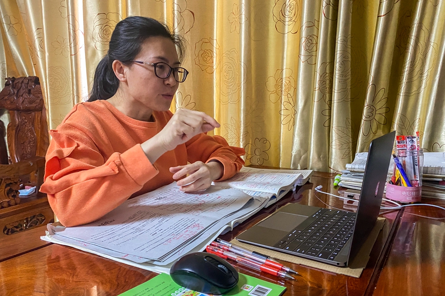 ↑1月5日晚,東興中學(xué)一名家住疫情封控區的老師在家為高三學(xué)生上網(wǎng)課(受訪(fǎng)者供圖)。