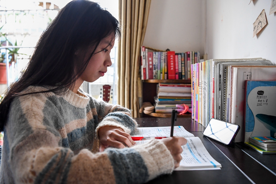↑1月6日,東興中學(xué)高三學(xué)生彭國梅在家上網(wǎng)課。