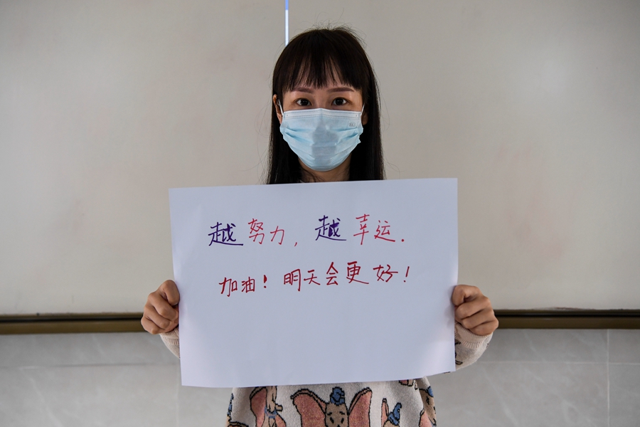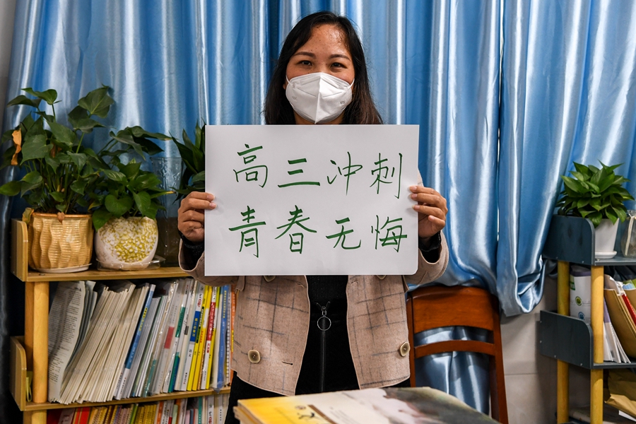 ↑東興中學(xué)語(yǔ)文老師蘇維曉為高三學(xué)生加油(1月5日攝)。