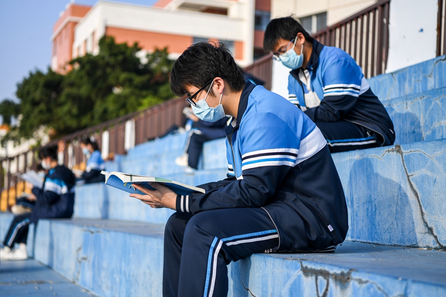 ↑1月5日,朱俊霖(前)和同學(xué)課后在室外背書(shū)。