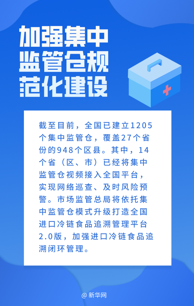 截至目前,全國已建立1205個(gè)集中監管倉,覆蓋27個(gè)省份的948個(gè)區縣。其中,14個(gè)?。▍^、市)已經(jīng)將集中監管倉視頻接入全國平臺,實(shí)現網(wǎng)絡(luò )巡查、及時(shí)風(fēng)險預警。市場(chǎng)監管總局將依托集中監管倉模式升級打造全國進(jìn)口冷鏈食品追溯管理平臺2.0版,加強進(jìn)口冷鏈食品追溯閉環(huán)管理。