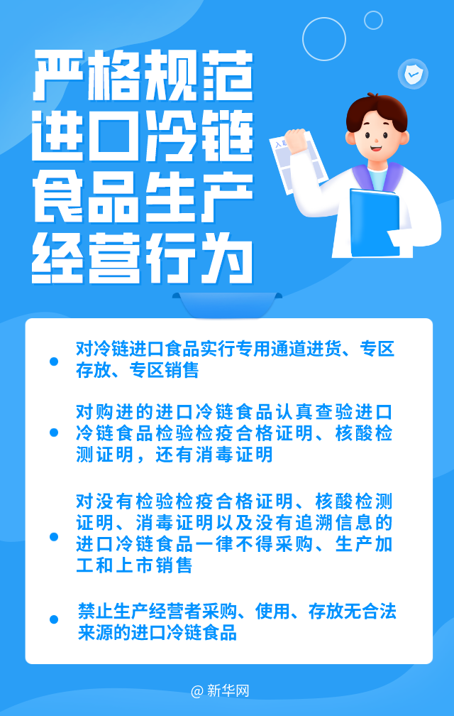 發(fā)布會(huì )上,市場(chǎng)監管總局食品經(jīng)營(yíng)司副司長(cháng)黨倩英介紹,市場(chǎng)監管部門(mén)嚴格落實(shí)國務(wù)院聯(lián)防聯(lián)控機制“人物同防”的工作要求,采取多種措施,嚴密防范新冠病毒通過(guò)進(jìn)口冷鏈食品輸入的風(fēng)險。其中,嚴格規范進(jìn)口冷鏈食品生產(chǎn)經(jīng)營(yíng)行為尤為重要。