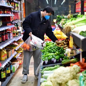 1月7日,西安曲江新區一小區超市內,一名居民在選購菜品。新華社記者 邵瑞 攝