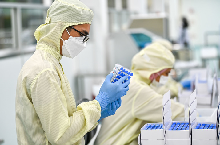 2021年10月5日,馬來(lái)西亞吉隆坡,一名工人在包裝本地灌裝生產(chǎn)的科興疫苗。新華社記者朱煒 攝