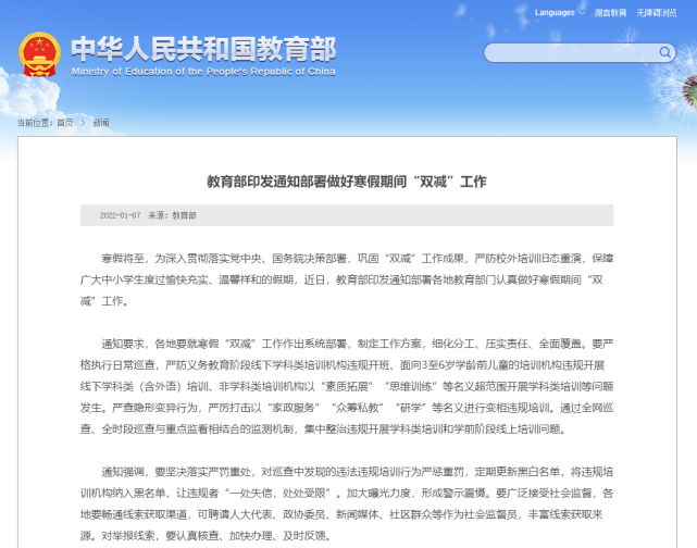 針對這些寒假可能出現的問(wèn)題,教育部專(zhuān)門(mén)印發(fā)通知強調,嚴防義務(wù)教育階段線(xiàn)下學(xué)科類(lèi)培訓機構違規開(kāi)班、面向3至6歲學(xué)齡前兒童的培訓機構違規開(kāi)展線(xiàn)下學(xué)科類(lèi)(含外語(yǔ))培訓、非學(xué)科類(lèi)培訓機構以“素質(zhì)拓展”“思維訓練”等名義超范圍開(kāi)展學(xué)科類(lèi)培訓等問(wèn)題發(fā)生。嚴查隱形變異行為,嚴厲打擊以“家政服務(wù)”“眾籌私教”“研學(xué)”等名義進(jìn)行變相違規培訓。