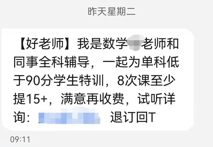 “【好老師】我是數學(xué)X老師和同事全科輔導,一起為單科低于90分學(xué)生特訓,8次課至少提15+……”臨近寒假,不少家長(cháng)都收到了類(lèi)似短信,推銷(xiāo)“一對一”培訓課程。