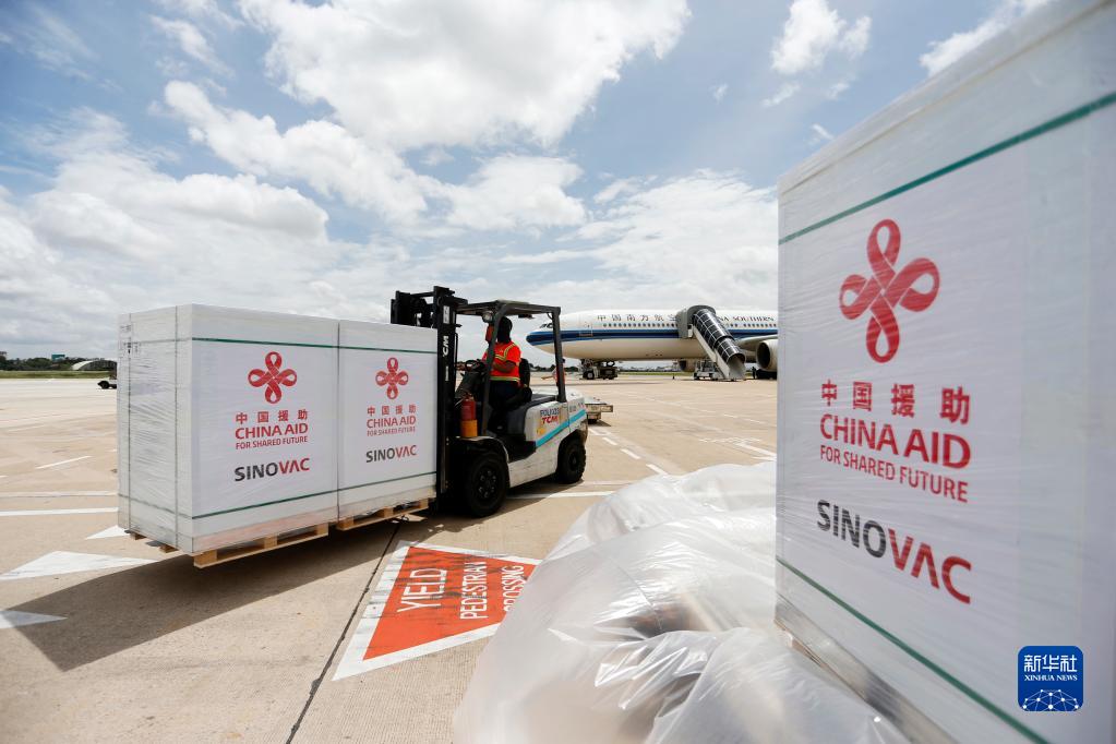 2021年10月14日,工作人員在柬埔寨金邊國際機場(chǎng)運輸中國政府援助柬埔寨的科興新冠疫苗。新華社發(fā)(批隆攝)