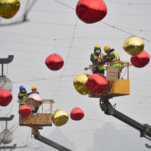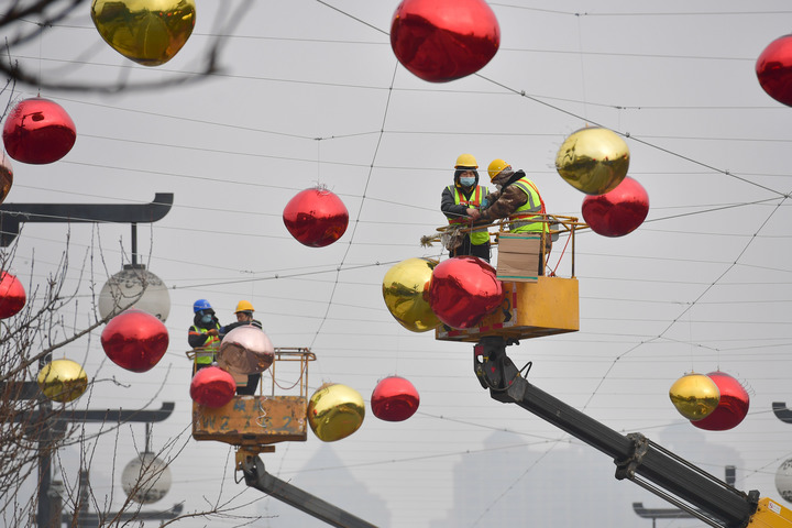 1月20日,在西安曲江池西路上,工人正在安裝彩燈。新華社記者邵瑞攝