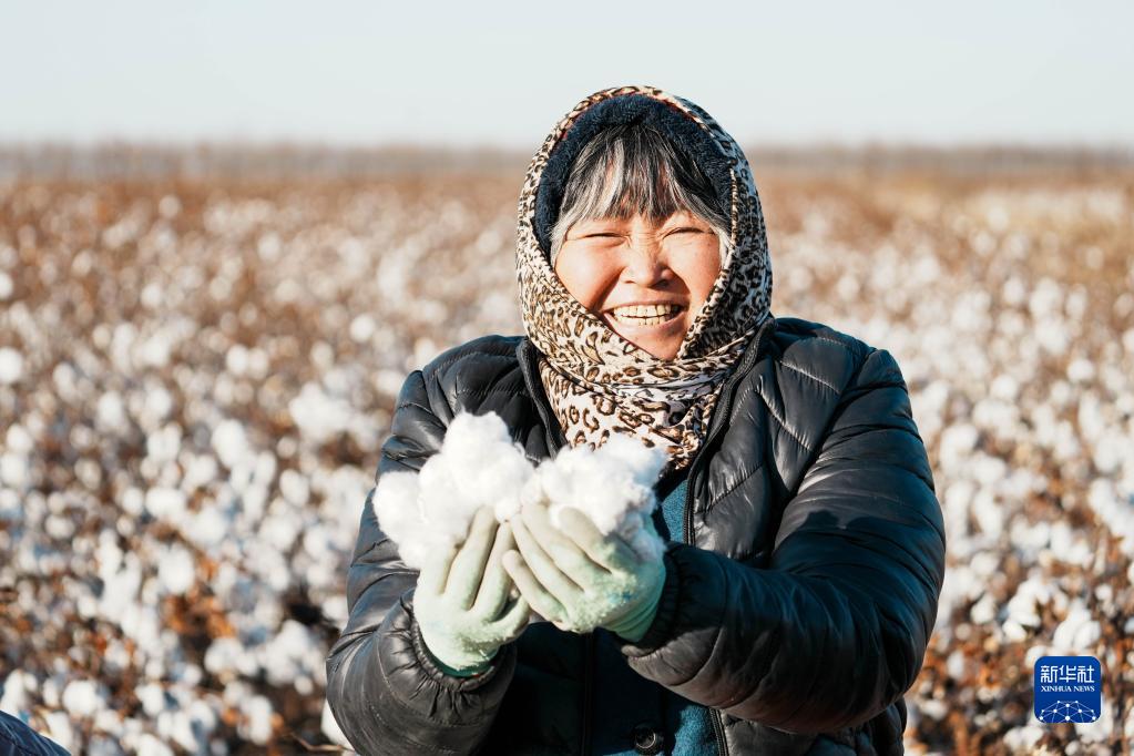 山東省無(wú)棣縣景國農機服務(wù)專(zhuān)業(yè)合作社棉農張元梅在棉田里采摘棉花(2021年12月1日攝)。新華社記者 朱崢 攝