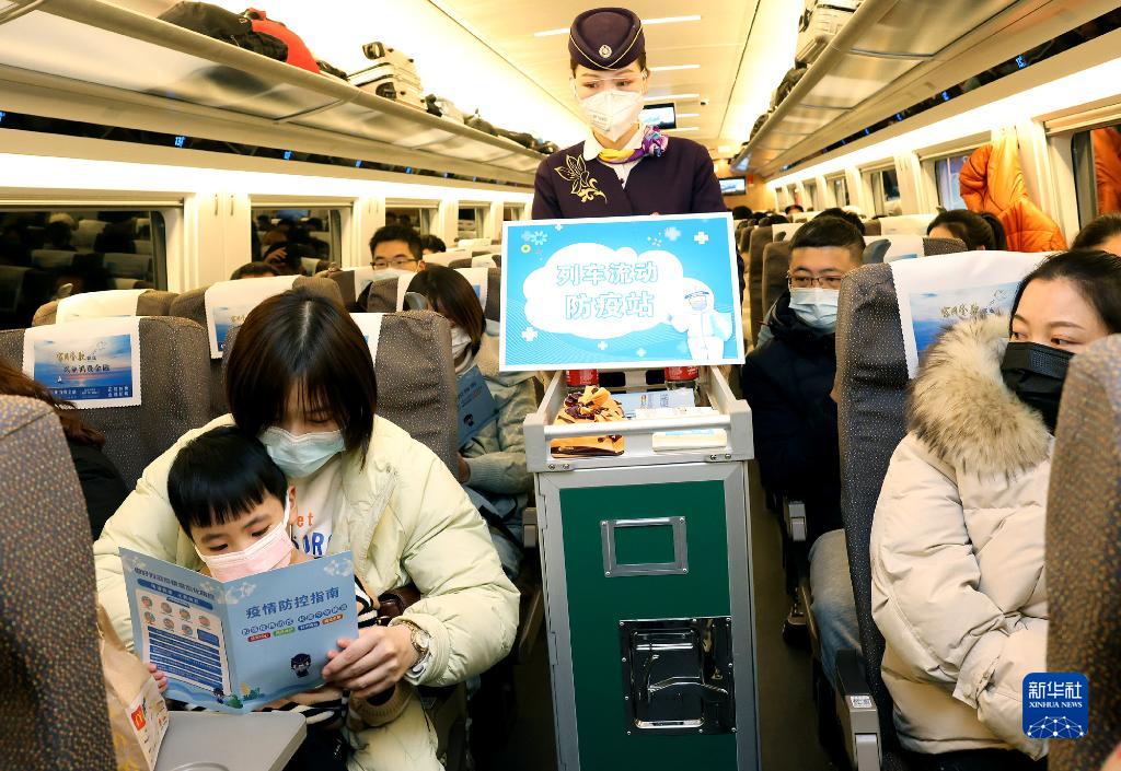 1月16日,乘務(wù)員在上海虹橋開(kāi)往漢口的G1724次列車(chē)上向旅客分發(fā)防疫宣傳冊。新華社記者 陳飛 攝