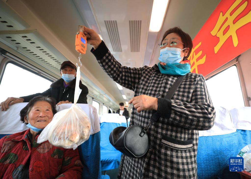 1月15日,在4318次列車(chē)上,一名農民給旅客購買(mǎi)的豬肉稱(chēng)重。這是一輛行駛在東北東部山區的慢火車(chē)。為助力鄉村振興,中國鐵路沈陽(yáng)局集團有限公司吉林客運段在列車(chē)上開(kāi)辦“年貨大集”。沿線(xiàn)各村鎮的農民不用等到進(jìn)城,就可在車(chē)廂里售賣(mài)自家山貨。新華社記者 楊青 攝