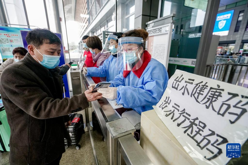 1月17日,在浙江省湖州市長(cháng)興站進(jìn)站口,防疫工作人員和轄區志愿者查驗進(jìn)站旅客健康碼、行程碼。新華社發(fā)(吳拯攝)