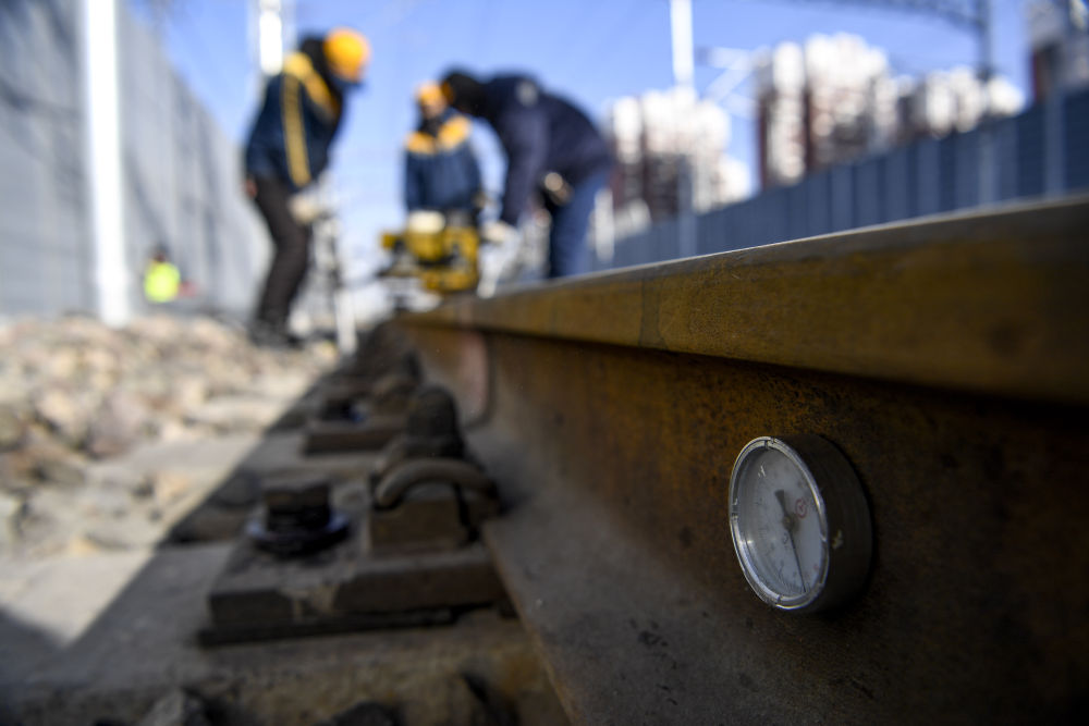 ↑2021年1月6日,中鐵蘭州局銀川工務(wù)段職工進(jìn)行搗固作業(yè)。