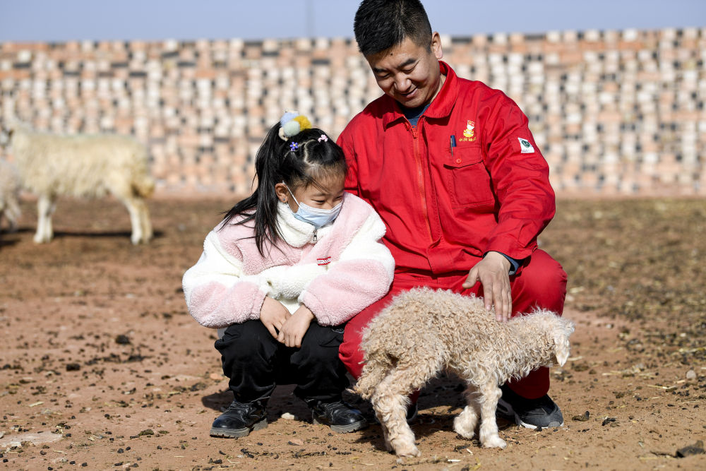 ↑7歲的王思淇第一次來(lái)到爸爸王濤駐村的紅井子村,她對一切都充滿(mǎn)了好奇。2021年2月11日,王濤和王思淇在撫摸一只農戶(hù)家的小羊羔。