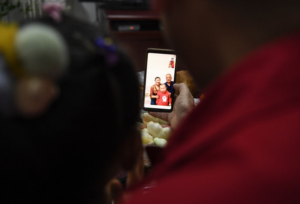 ↑2021年2月11日除夕夜,王濤和妻子女兒在宿舍同在銀川的父母和2歲的兒子通視頻電話(huà)。