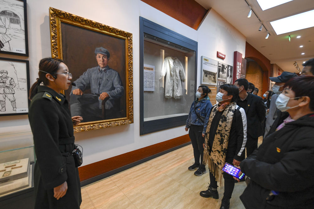 ↑2021年4月15日,寧夏鹽池縣革命烈士紀念館講解員(左一)為前來(lái)參觀(guān)的游客介紹毛澤民在鹽池縣的故事。