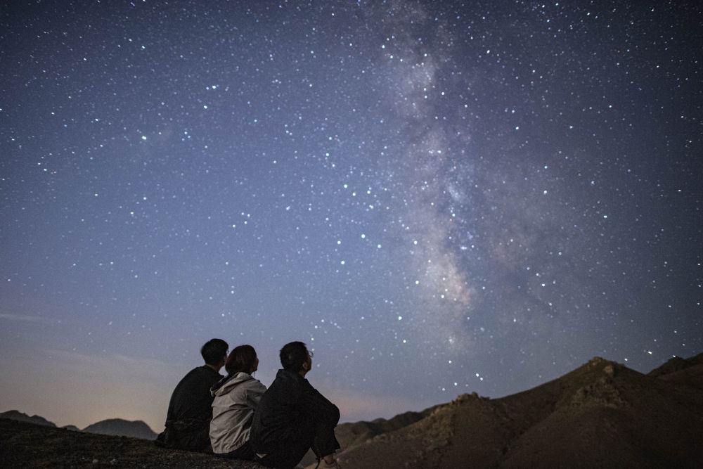 ↑新華社記者馮開(kāi)華、馬思嘉和唐如峰(從左至右)采訪(fǎng)結束后,在長(cháng)城腳下仰望星空(2021年8月13日攝)。