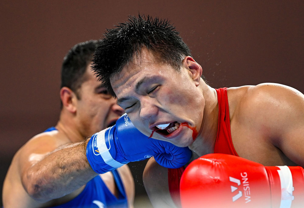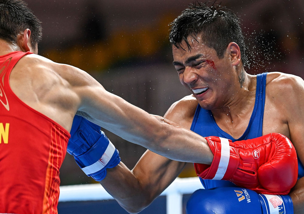 ↑2021年9月16日,云南隊選手山?。ㄗ螅┡c陜西隊選手阿卜杜熱伊木·麥麥提在男子63公斤級半決賽中。