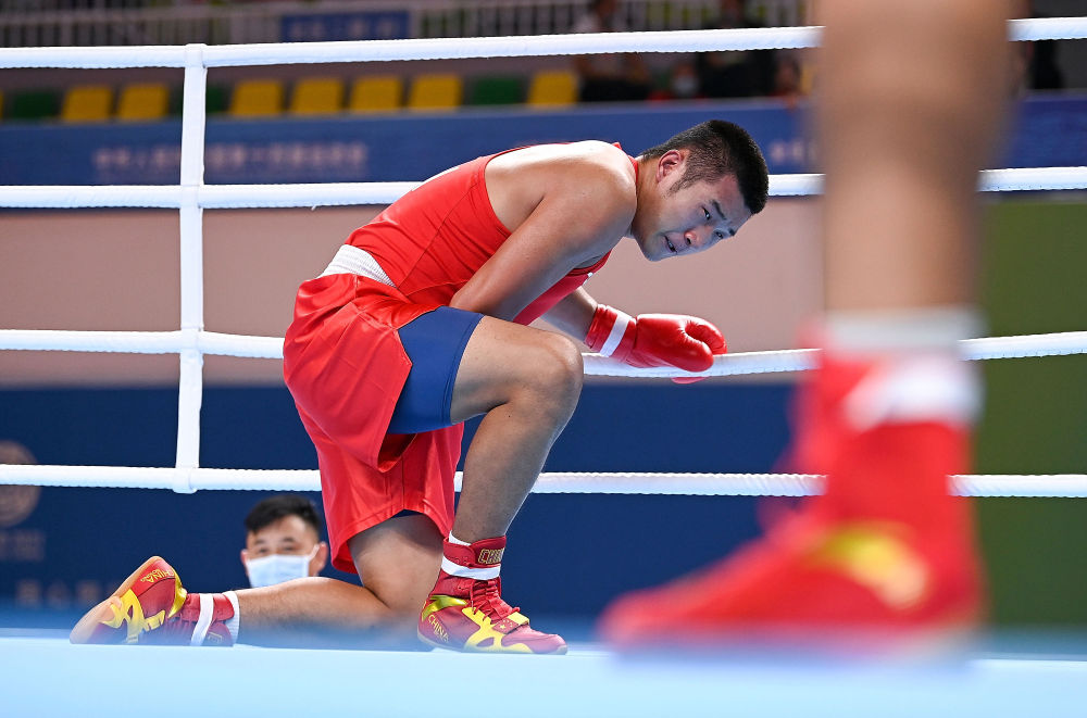 ↑2021年9月18日,廣東隊選手馬金陽(yáng)(左)在男子91公斤以上級半決賽中被擊倒。