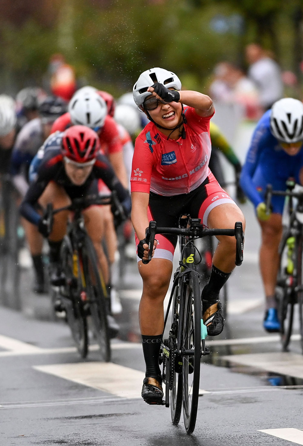 ↑2021年9月26日,香港隊選手李思穎在公路自行車(chē)女子個(gè)人賽決賽中率先沖過(guò)終點(diǎn),獲得冠軍。