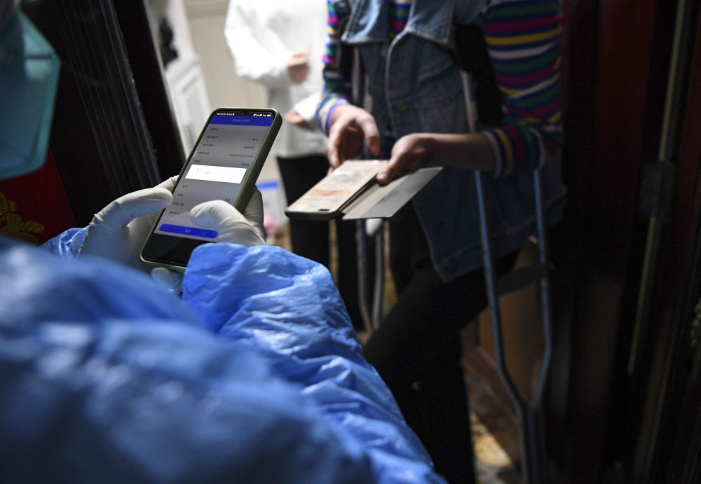 ↑2021年10月23日,在寧夏銀川市金鳳區北京中路街道采樣點(diǎn),醫務(wù)人員(左)在掃碼登記居民信息。