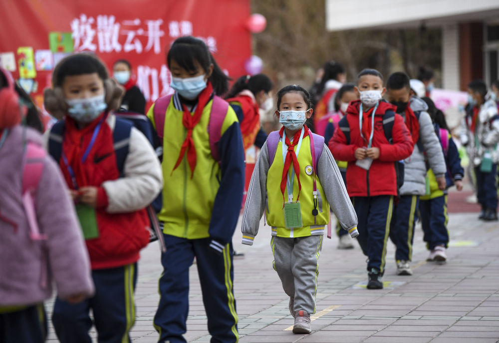 ↑2021年11月25日,寧夏銀川市興慶區第四小學(xué)學(xué)生重返校園。