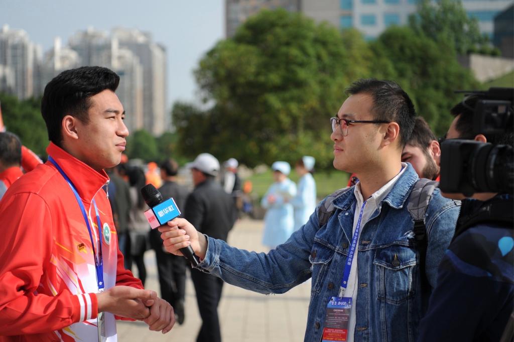 ↑馬文軒(左)在2018年的一場(chǎng)馬拉松賽上擔任醫療志愿者時(shí)接受記者采訪(fǎng)。