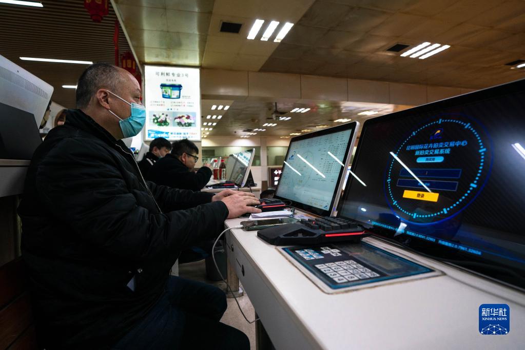 1月21日,花商馬金科在昆明國際花卉拍賣(mài)交易中心內競拍鮮花。新華社記者 王冠森 攝
