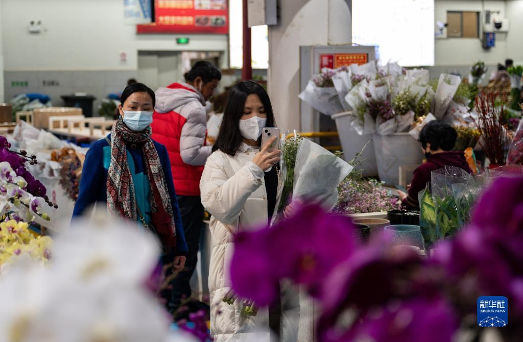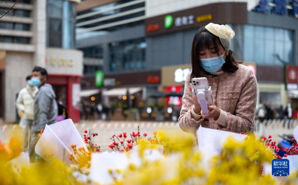 1月21日,花商畢茜茜在花攤直播銷(xiāo)售鮮花。新華社記者 王冠森 攝