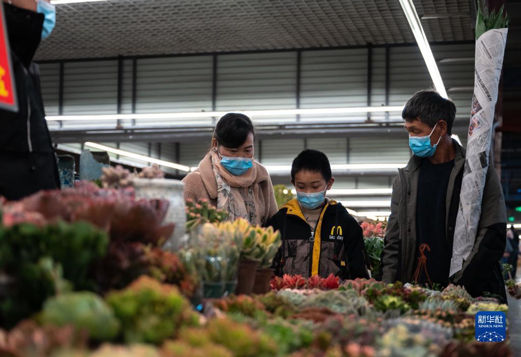 1月21日,顧客在昆明斗南花卉交易市場(chǎng)選購多肉植物。新華社記者 王冠森 攝