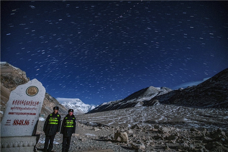 在西藏日喀則,仰望星空,“追星人”打卡珠峰高程測量紀念碑。當中國空間站飛越珠峰上空時(shí),移民管理警察宋鑫攝影創(chuàng )作出一場(chǎng)“天宮”奇觀(guān),堆棧軌跡劃破瀑布般的銀河,呈現科幻視覺(jué)盛宴。